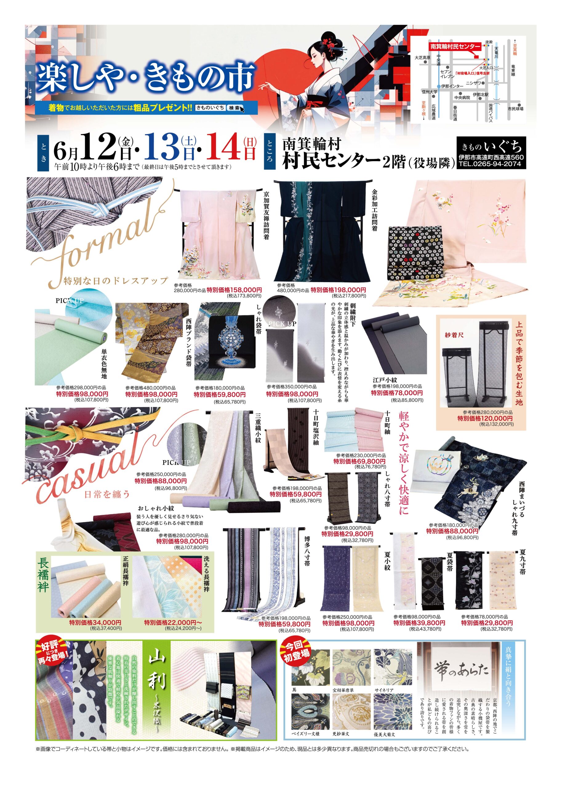 「楽しや・きもの市」 時:6月12日(金)~14日(日) 所:南箕輪村村民センター2F(村役場となり)